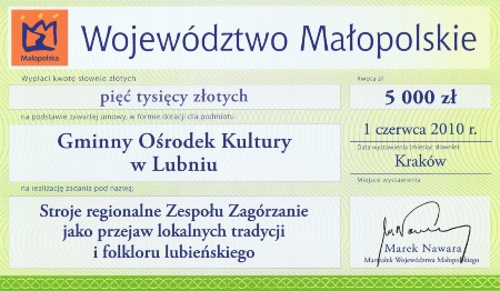 ____________________________________________ 17 października 2010 r. Zespół Regionalny "Zagórzanie" obchodził 10 rocznicę działalności. Z tej okazji w sali OSP Lubień odbyła się miła uroczystość, w trakcie której Kierownik Zespołu, p. Aniela Wilczak przedstawiła historię powstania i trudne początki działalności "Zagórzan". Podsumowała także 10-letni dorobek Zespołu, przypominając liczne występy nie tylko na terenie gminy Lubień ale także na terenie powiatu myślenickiego i poza jego granicami. W swoim wystąpieniu podziękowała wszystkim , którzy wspierają Zespół nie tylko swoją życzliwością, lecz także finansowo. Złożyła także podziękowania Członkom Zespołu za ich pracę i zaangażowanie w kultywowaniu tradycji regionu. ______________________________________________________________________________